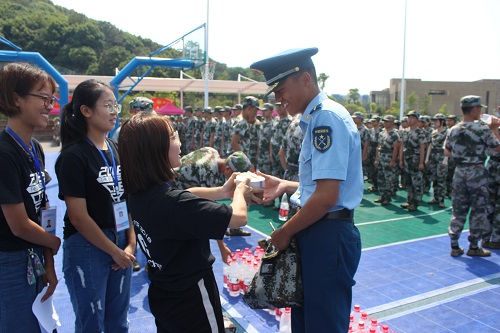 在军训场上,新生们也为教官们送上祝福,每个排面都在教官到达时大声喊出:“教官好!教官辛苦了!祝教官教师节快乐!”洪亮的声音包含了新生们对教官每日认真指导训练,耐心纠正他们动作的感激之心。班助们也代表新生,将装的满满礼物盒送到教官手中。教官们在收到礼物时都显得很意外,相信他们在看到新生们的心里话时,也能感受到新生对他们的喜爱和感谢。